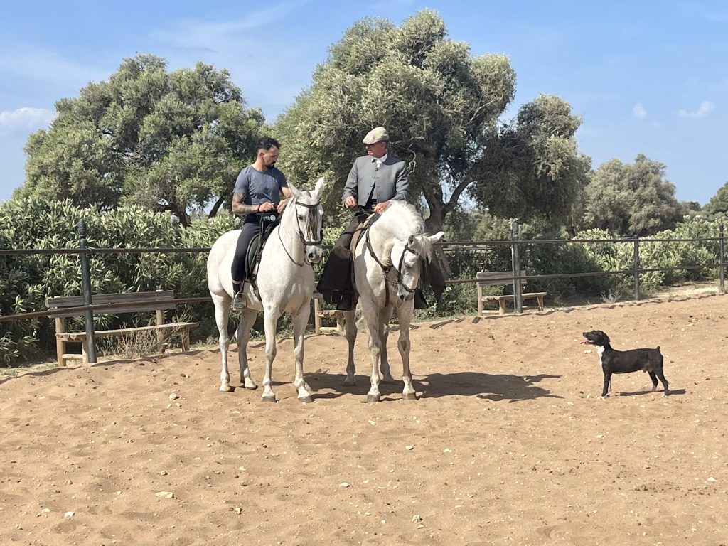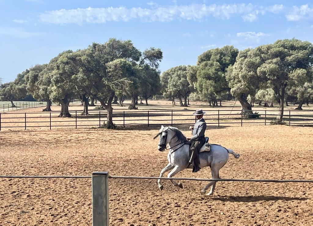 A karámban megmutatták, hogy kell egy kézben fogni a szárat, egy kör lépés, egy kör ‘galopp’ mindkét irányba és kezdetét vette a birtoklátogatás. Megmutatták hol élnek természetes körülmények között a jószágok végeláthatatlan területeken, azt is hol a ring, merre vannak a bikák, a lovakon pedig ültek a vendégek. Aki igazi vaquero lovak hátán szeretne egy mély, sallangmentes lélegzetet venni a spanyol lovas hagyományokból, annak kihagyhatatlan élmény.